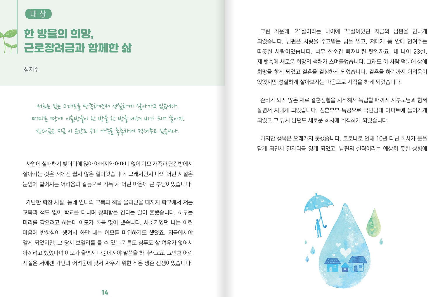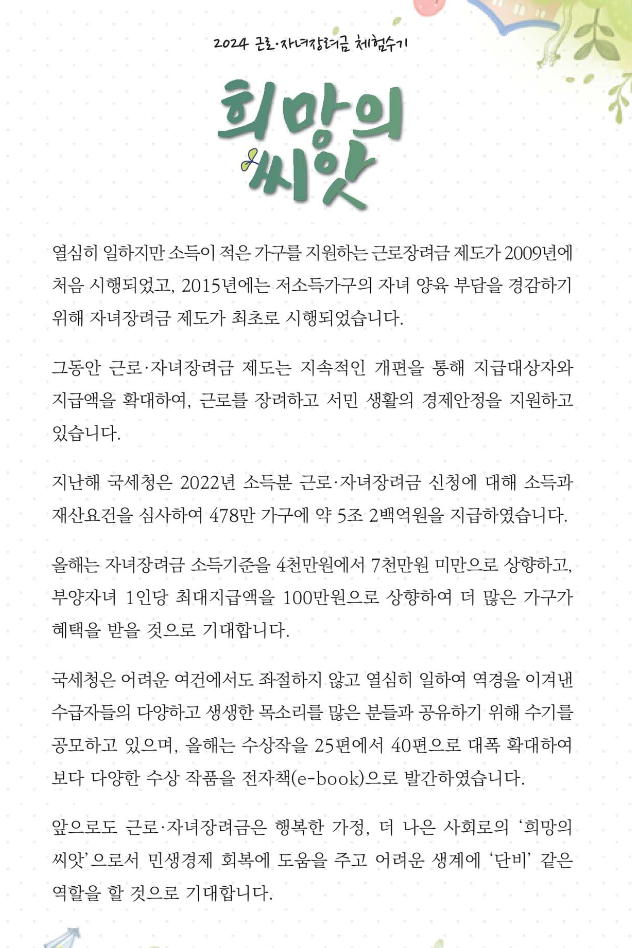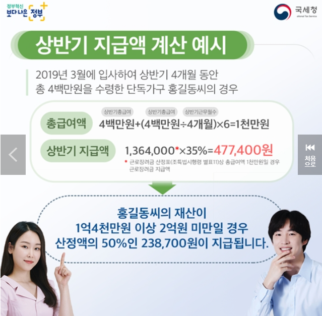 근로를 하고 있는 사람이 소득이 적어서 생활이 어려운 근로자나 사업자에 대해 소득에 따라 근로장려금을 지급하는 근로연계형 소득지원입니다.