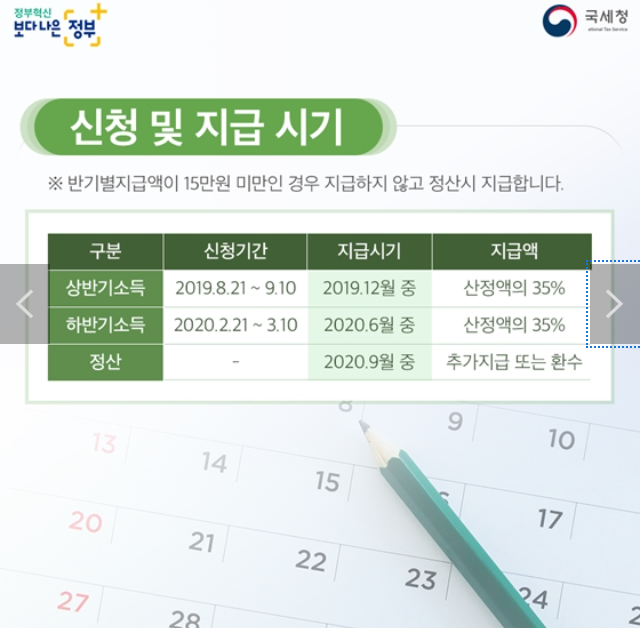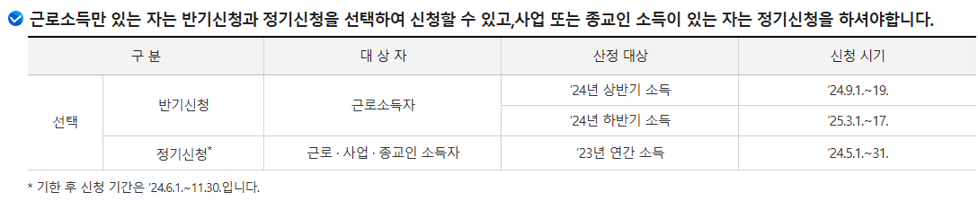 신청기간 : 근로소득자, 사업소득자, 종교인소득자 모두 정기신청을 할 수 있기 때문에, 지금은 정기신청의 기간후 신청으로 11월 30일까지로 나와 있습니다.