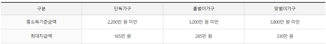 여기에 총소득이란 계산을 해야 하는데, 실질적으로는 계산하기가 쉽지는 않아서 위의 조건에 근접했다면 약간 초과되더라도 일단 신청하고 보는게 가장 좋을 것 같습니다.