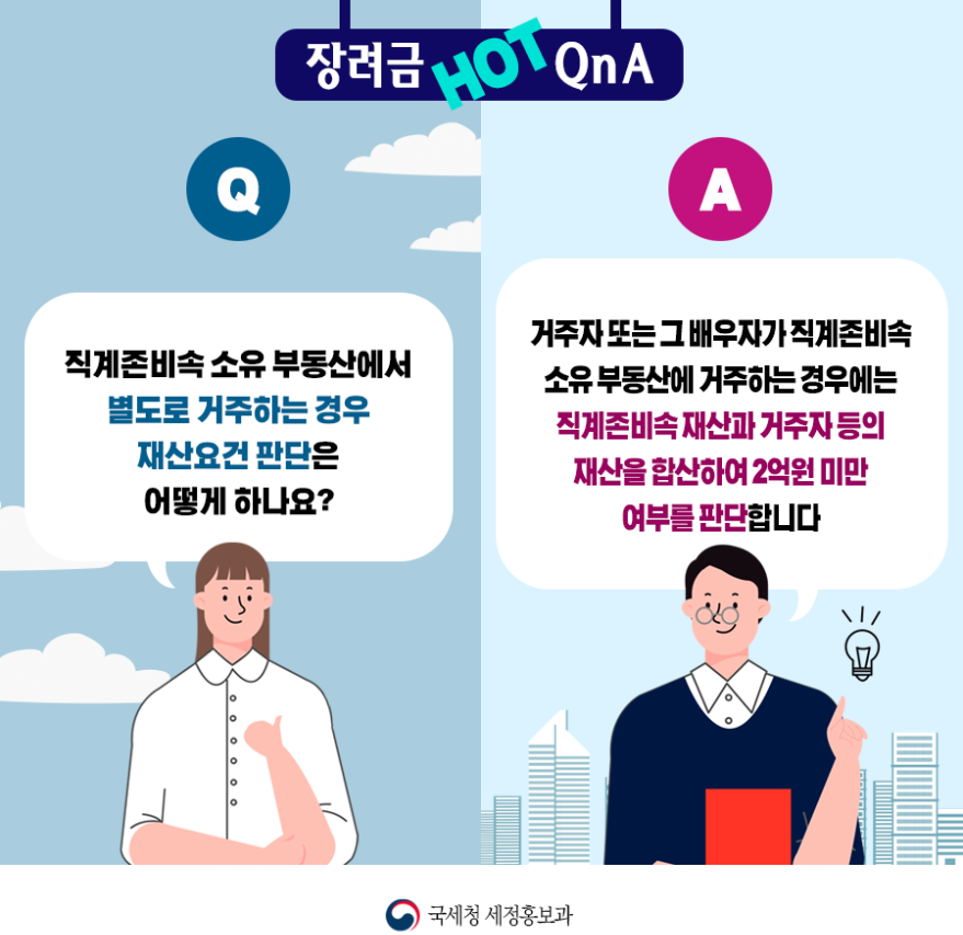 - 홑벌이 가구:① 배우자의 “총급여액 등”이 3백만원 미만인 가구 ② 배우자가 없어도 부양자녀(18세 미만) 또는 70세 이상 직계존속(각각의 연간 소득금액이 100만원 이하이고 주민등록표상 동거가족으로 생계를 같이 할 것)이 있는 가구