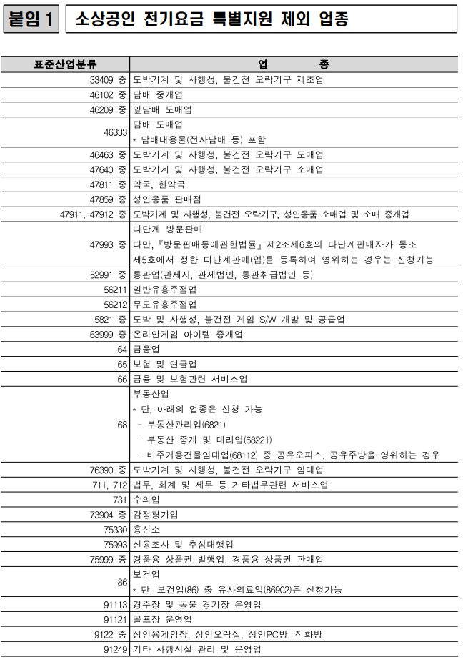 그리고 제외 업종이 있는데, 아래 제외업종에 해당하는 업종은 연 매출이 6천만원이 넘어가면 지원에서 제외됩니다.