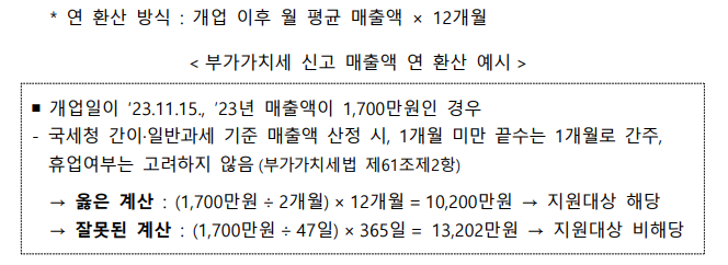 만약 연중 개업한 경우에는 개업 이후 월 평균 매출액을 연환산하여 계산합니다.